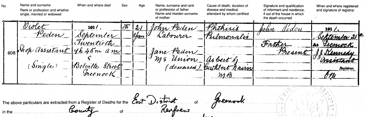 Died | 20.9. | 1911 | at | Greenock | Aged 21 | certificate |