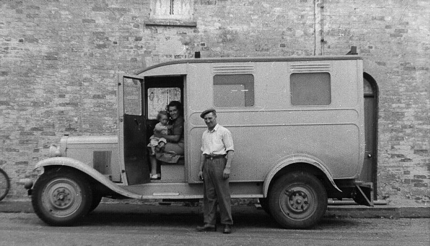 Jim Baker with his ex-army ambulance, in front of Vulcan Cottages, on the North side of Lydd Rype. His sister-in-law Rita is sitting in the van with her son Ian.