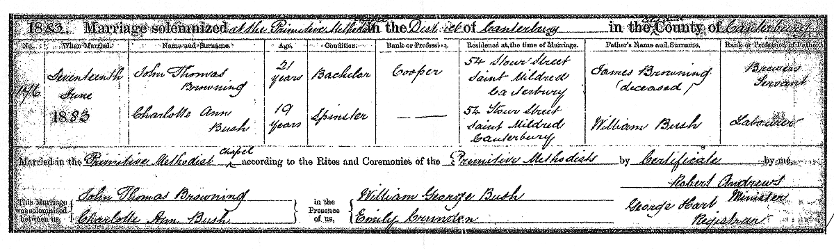 Stour Street, St Mildred's, Canterbury [2]. Soon afterwards he married Charlotte Bush [4], and over the following years they had nine