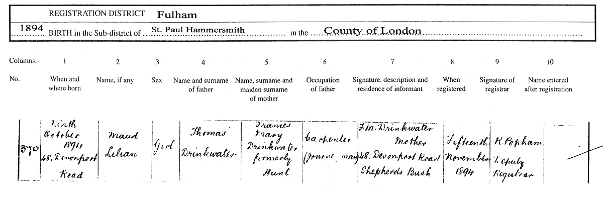 Born | 9.10. | 1894 | . | at | 48 Devonport Rd, St Paul Hammersmith | Certificate |