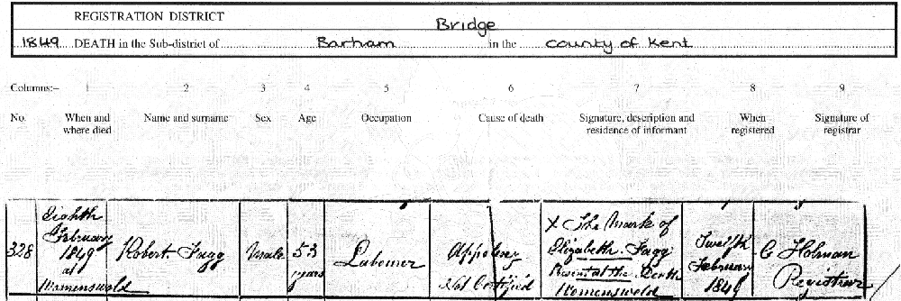 Robert Fagg was born in 1796 or 1797. He was a farm labourer living in the Elham valley south of Canterbury. In 1818 he married Elizabeth Baldock, and they had 12 children. He died in Womenswold of a stroke (apoplexy), at the age of 53.