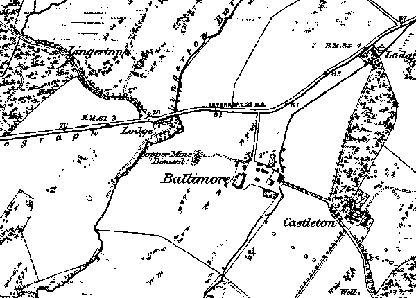 Below: This extract from the 1873 1:10,000 Ordnance Survey map shows Castleton, where John McKechnie lived at no.4 with his family in 1851, and Lingerton, where John's father Dugald lived at the time of his marriage in 1788. Both are on the Kilmory estate, just east of Lochgilphead. |