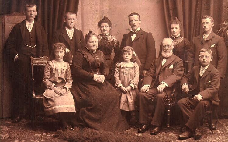 Front row, left to right: Nan, Agnes (mother), Chrissie, Nicol (father), Dugald.