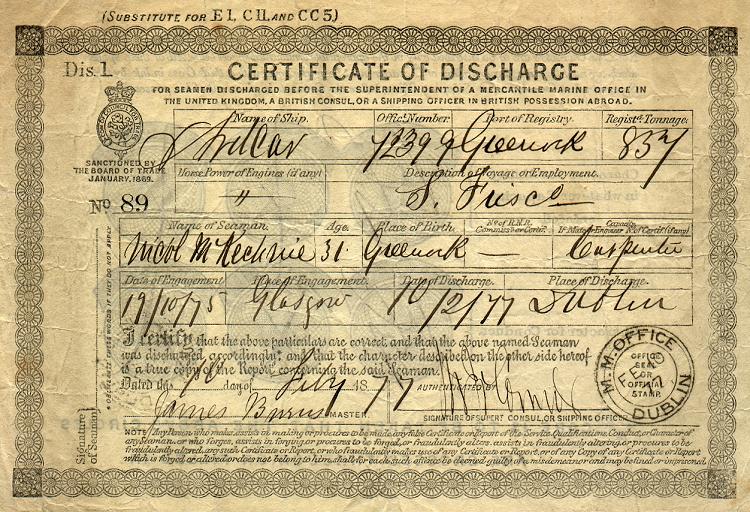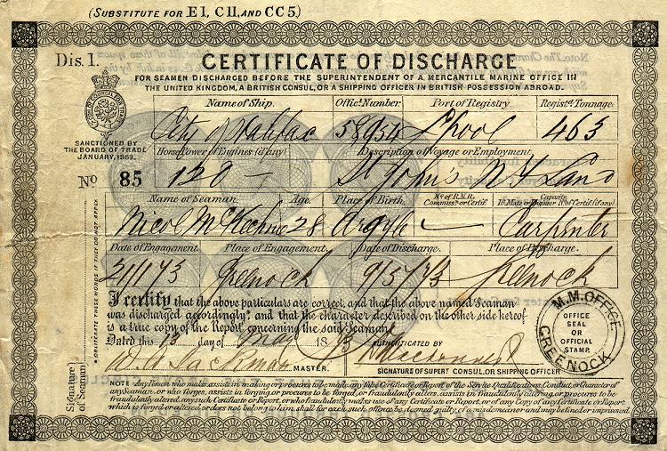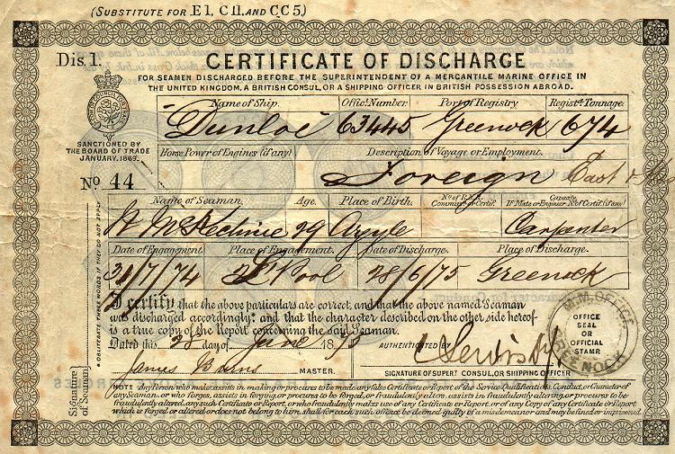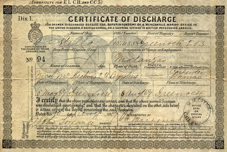 The discharge certificate was issued by the port shipping officer on behalf of the board of trade. As well as giving name and personal details of the seaman and details of the ship and voyage, on the reverse it gave an appraisal ("very good", "good", or "declines to report") on "ability in whatever capacity engaged", and in "conduct". I am pleased to report that on all voyages, Nicol McKechnie was marked "very good" on both counts.