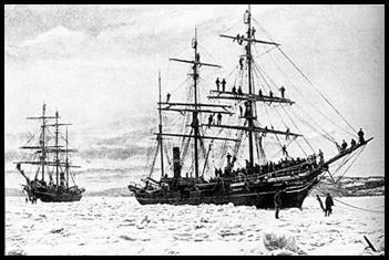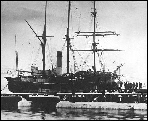 | Steam ships similar to 'City of Halifax' in the Newfoundland seal fisheries during the 1860s or 70s. These ships had thick wooden hulls to resist the ice, and were still in use in the 1930s. | The steam ship 'Aurora' in port, probably at St John's, Newfoundland. Many years later, 'Aurora' was a support ship for Shackleton's ill-fated expedition to the Antarctic. |