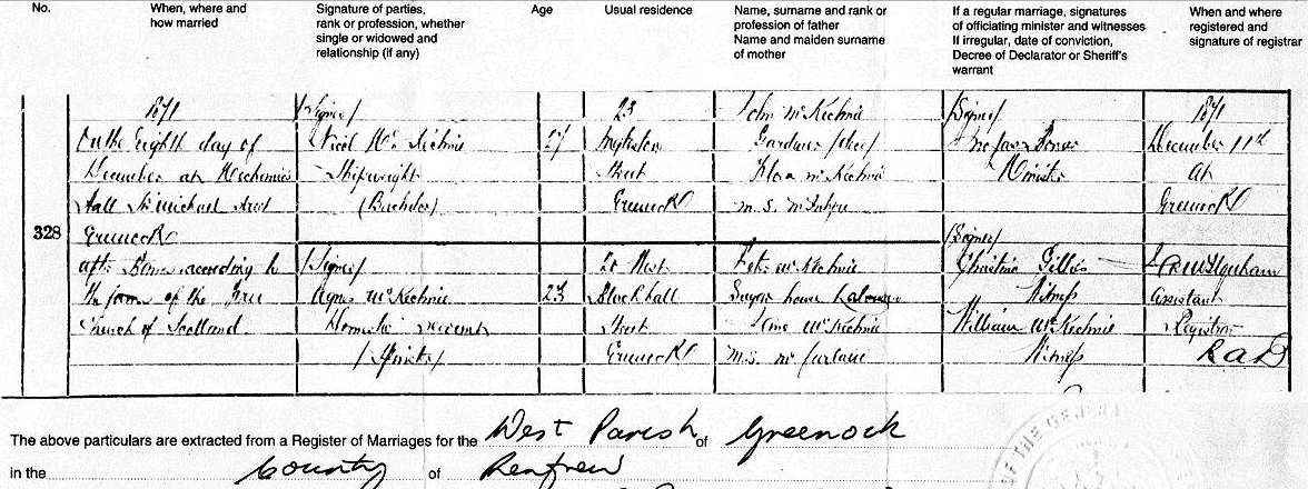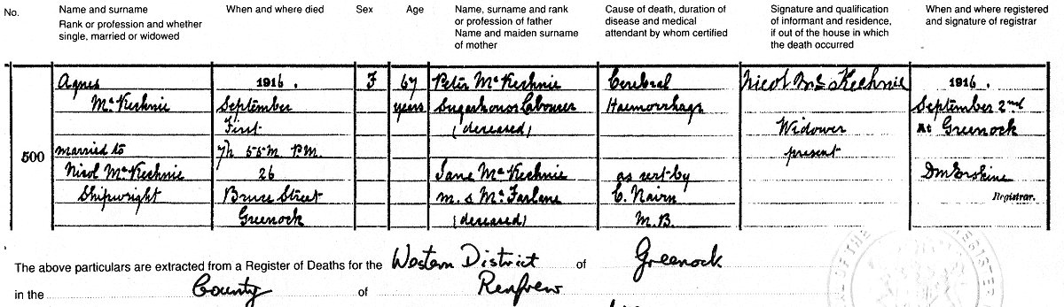 Willowbank, Forsyth Street, West Greenock[7]. The same year she married Nicol McKechnie, who at the time was a seaman and spent