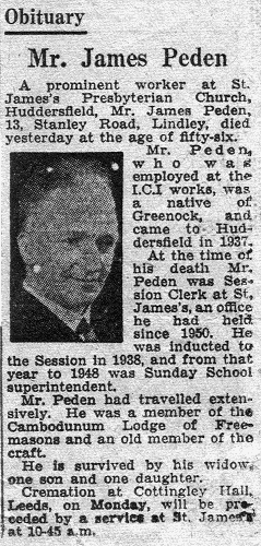 Jim spent some time in the merchant navy [5]. In 1937 Jim moved to Huddersfield, where he was employed by I.C.I. [4]. He lived with his wife and family at 13 Stanley Road, Lindley [4]. He was a prominent worker at St. James' presbyterian church, Huddersfield, where he held the office of Session Clerk from 1950 until his death [4]. He was inducted to the Session in 1938, and from then until 1948 was Sunday School superintendant [4]. Jim was also a long-standing Freemason, and a member of the Cambodunium Lodge [4].