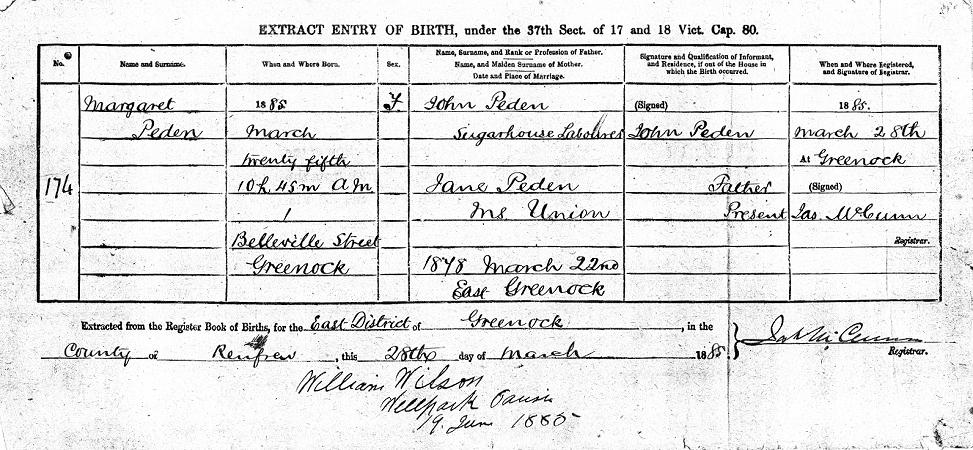 1 Belville Street, Greenock in 1885, to John and Jane Peden. She
